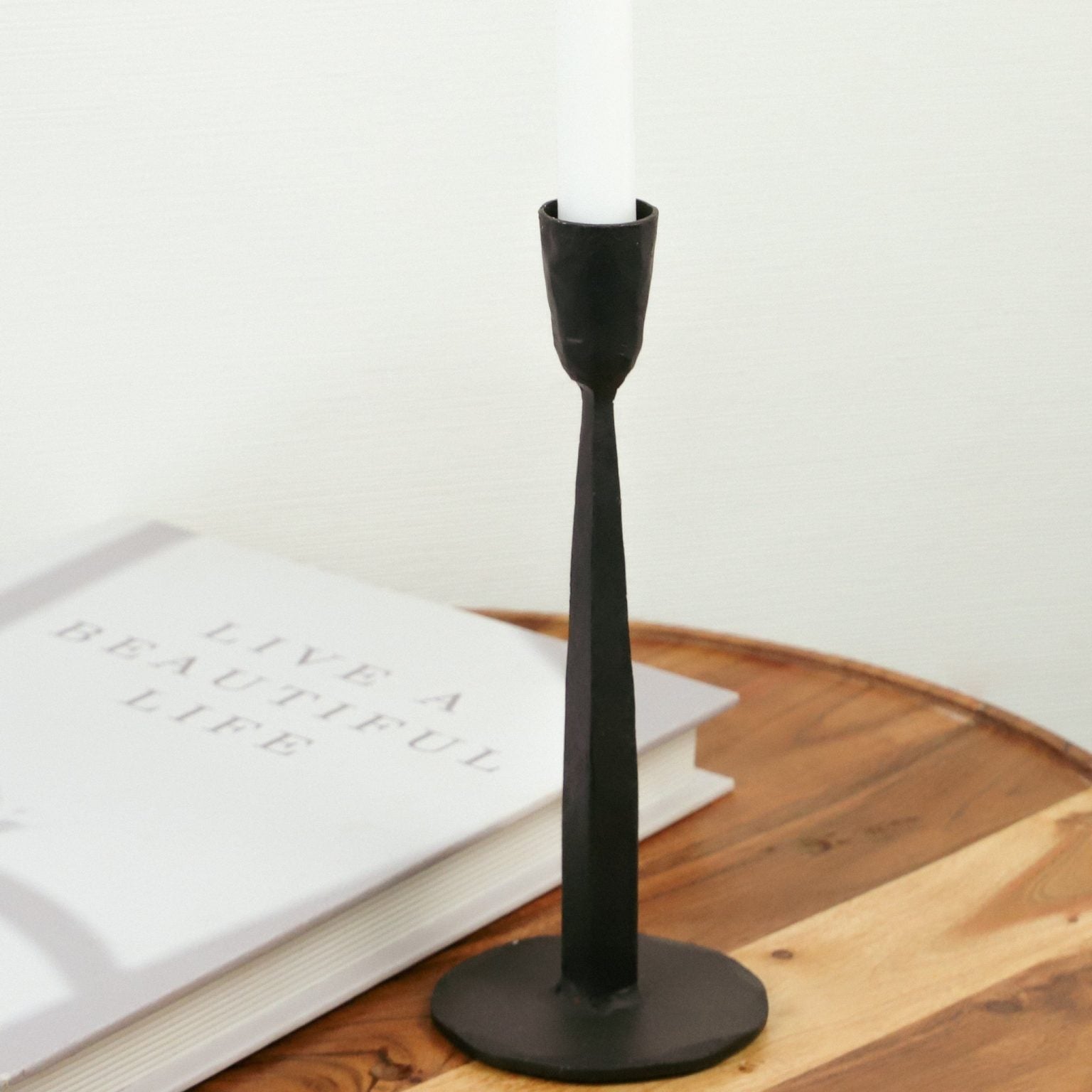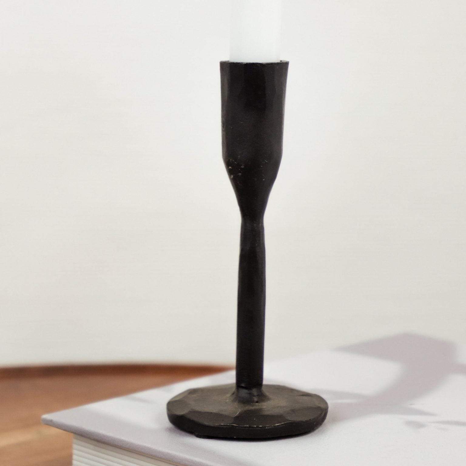 BLACK IRON TAPER CANDLE HOLDER HAS A PRIMITIVE YET MODERN APEAL. AVAILABLE IN TWO SIZES, 4" AND 9"