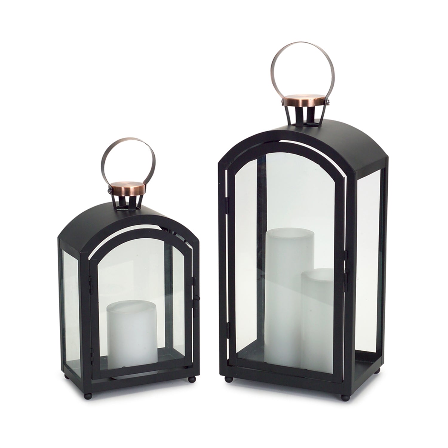 This black metal lantern features arched glass panels accented with copper details. It is offered in two sizes: 15 inches and 20 inches tall.