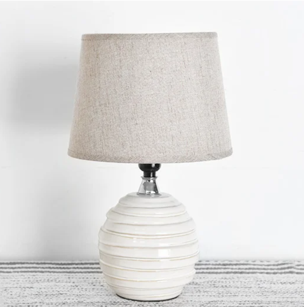 This petite lamp features a ceramic base with horizontal stripes carved into the design and a beige linen lamp shade. Perfect for a nightstand, hallway, or kids room.
