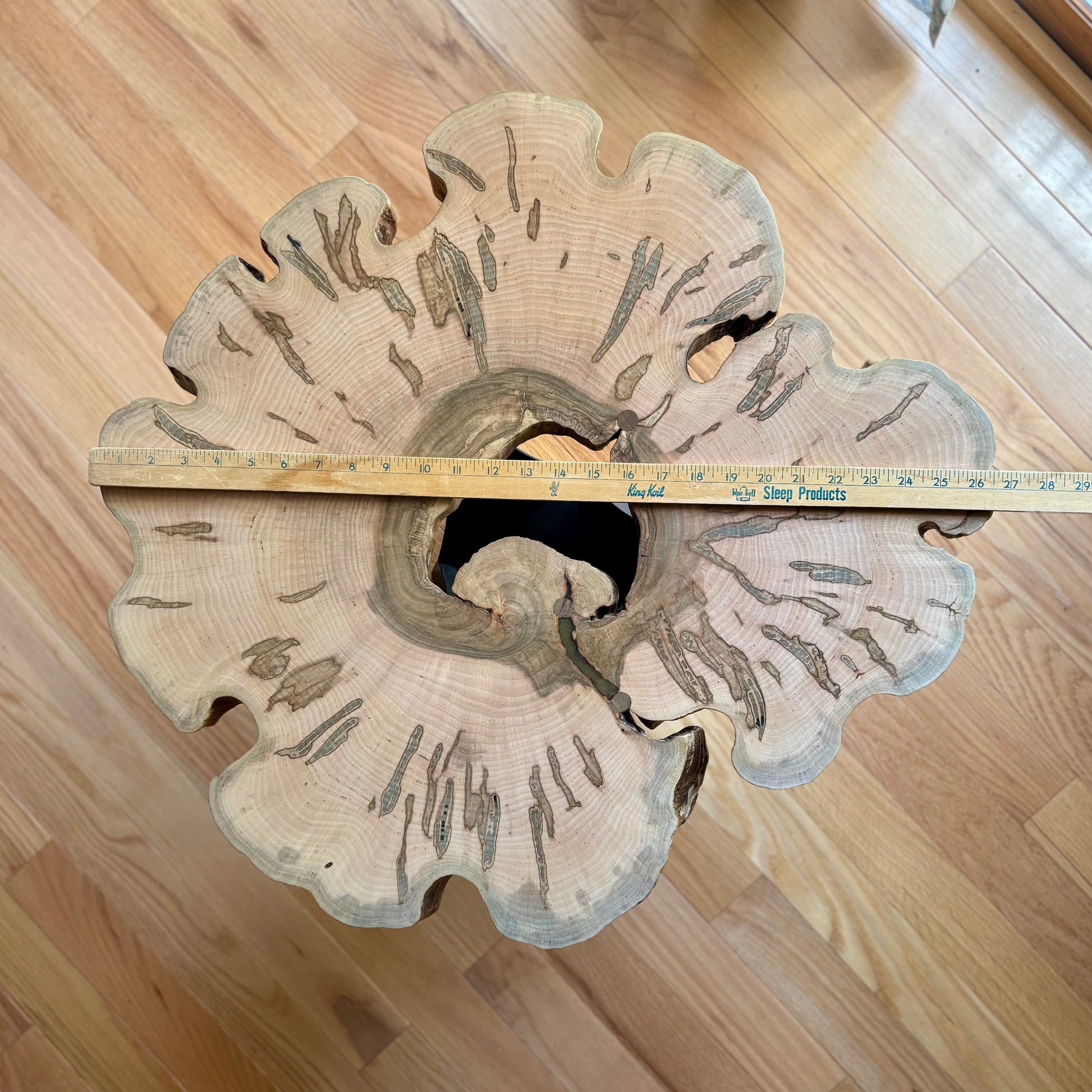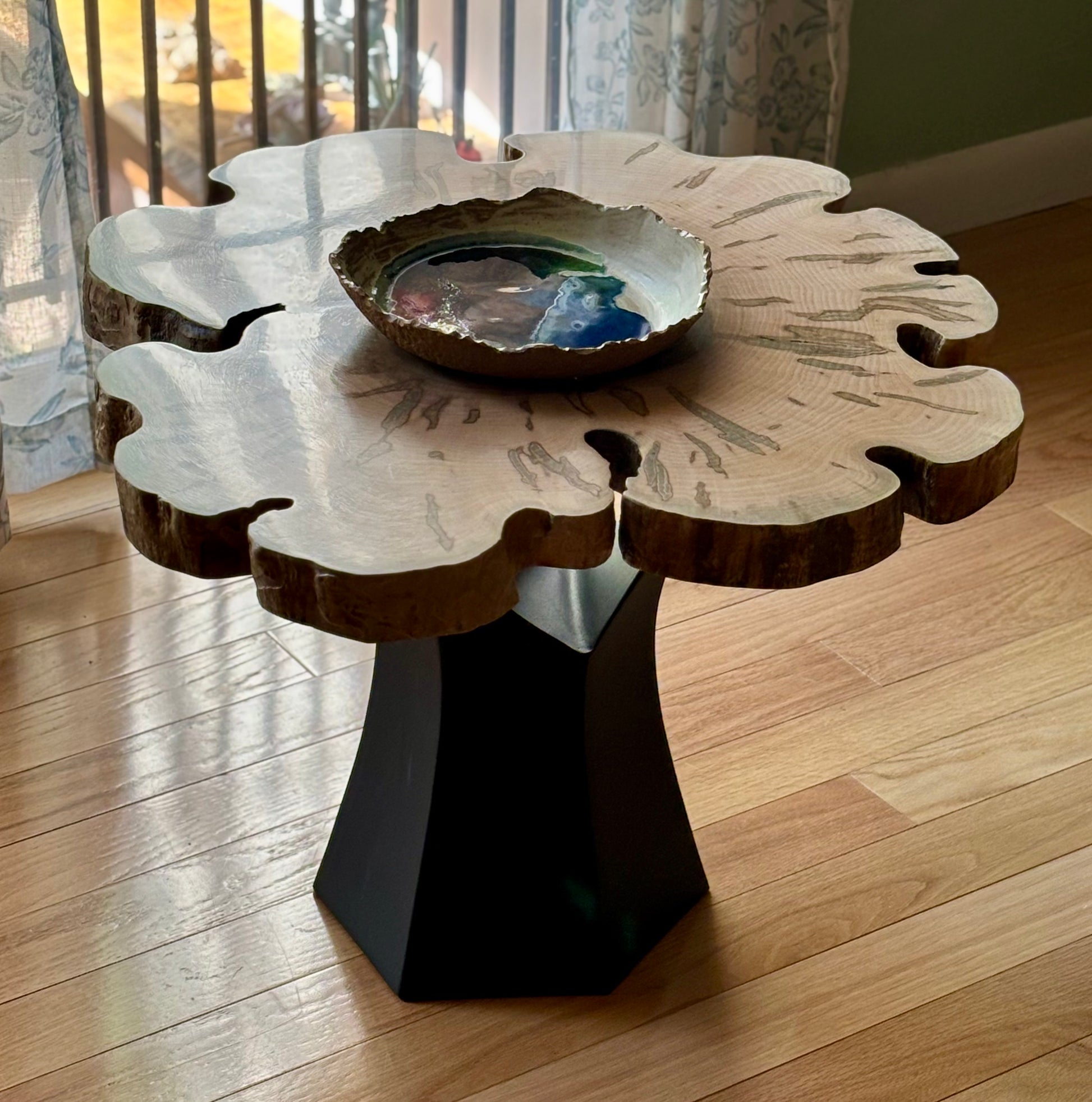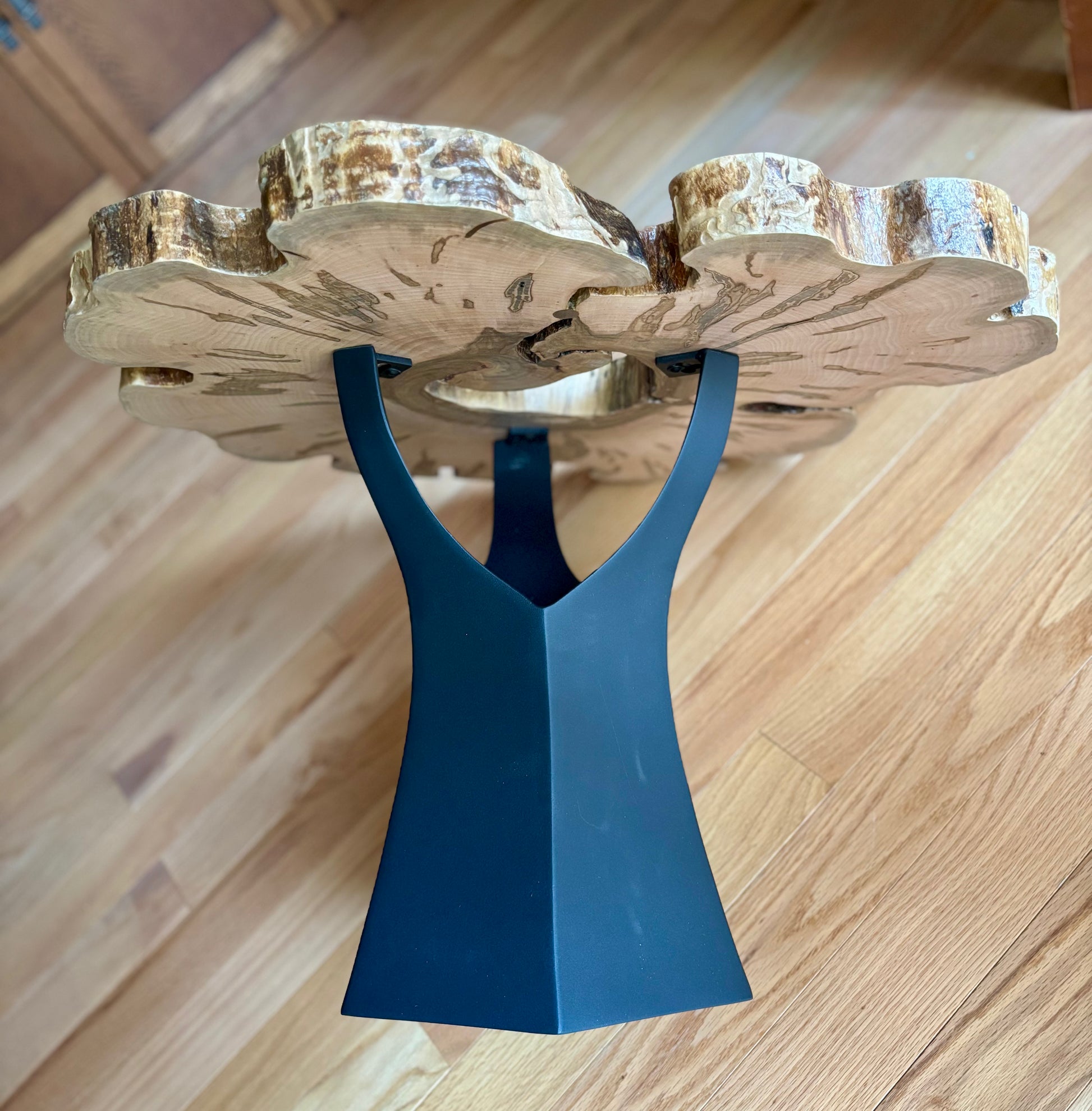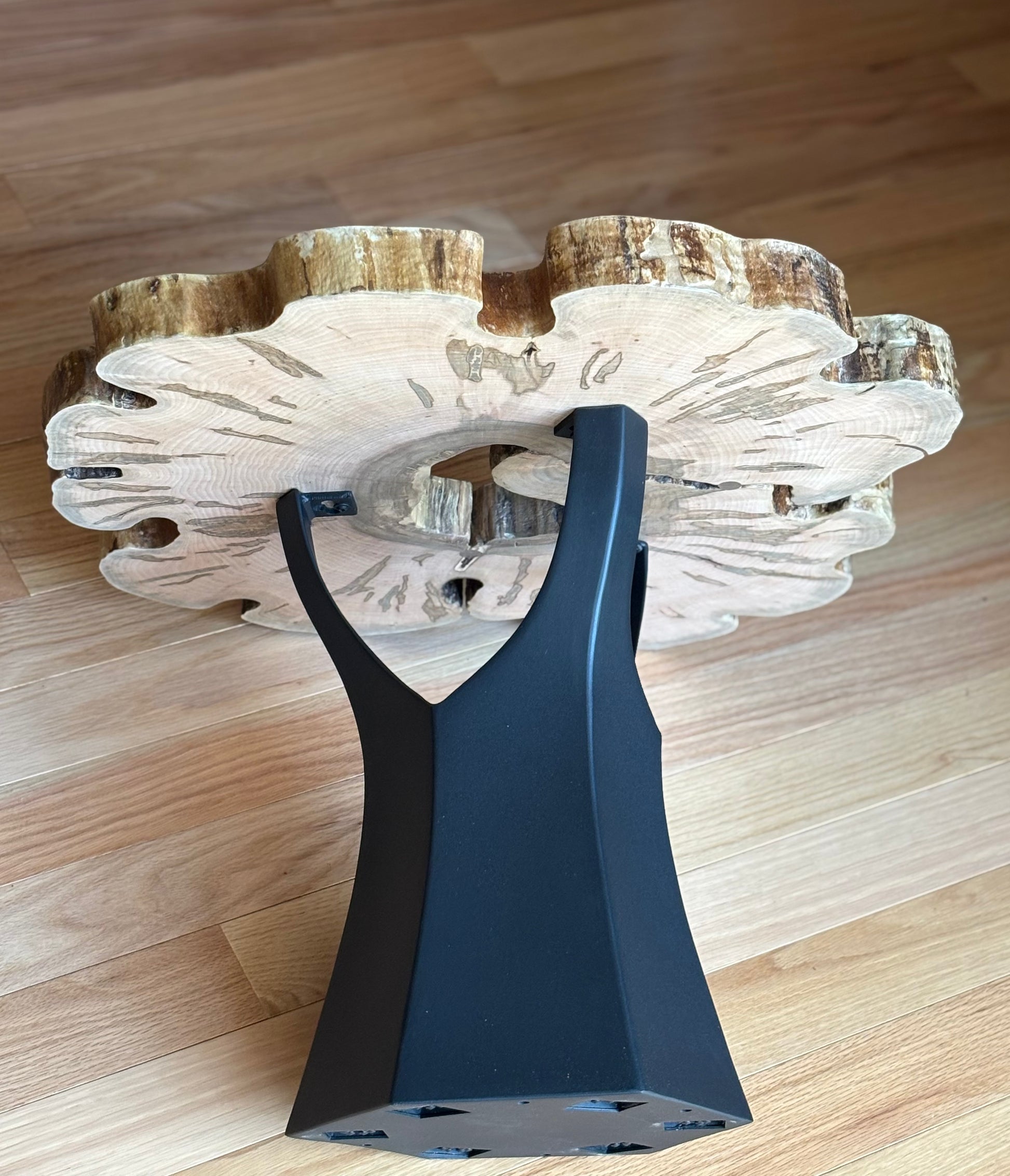 Handcrafted in Berlin, CT. this premium 2” thick hardwood maple slab, sourced from Plainville, CT, is engineered for dual functionality as both an occasional table and a charcuterie board. The surface is expertly buffed to a smooth, glossy finish and protected with a food-safe hybrid water-based urethane topcoat. Structural integrity is enhanced by walnut pegs reinforcing critical stress points. The slab is supported by a Namu-designed rust-resistant steel base featuring adjustable levelers for precise stability. Measuring 18” in height with an average diameter of 26”, this table exemplifies both craftsmanship and durability.