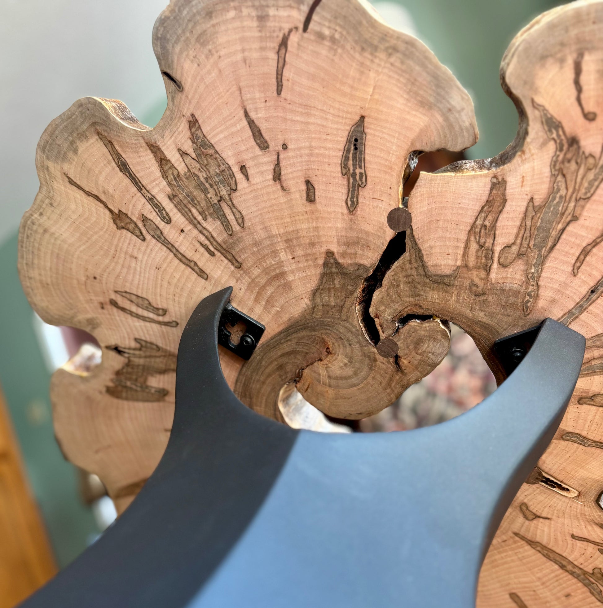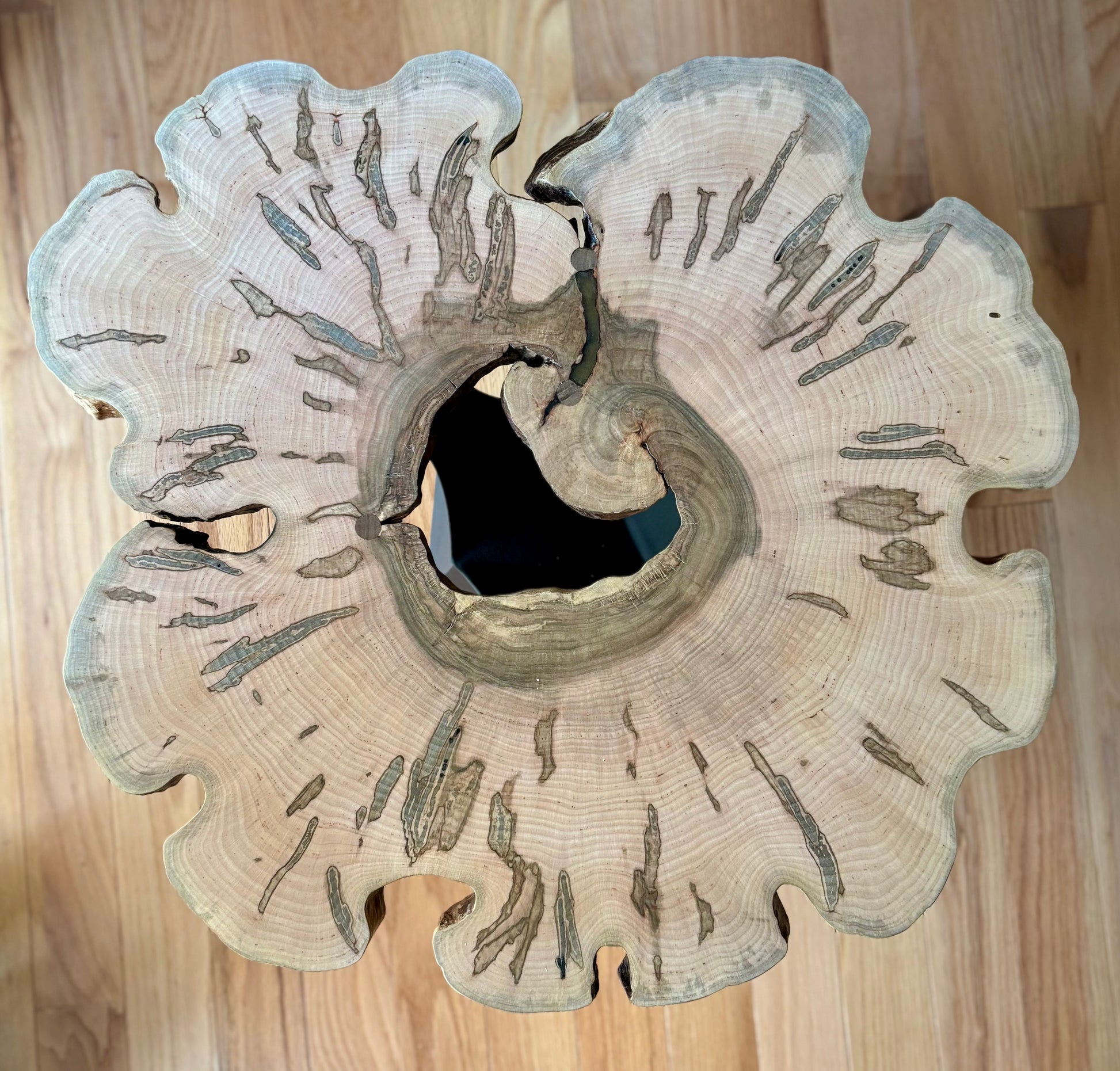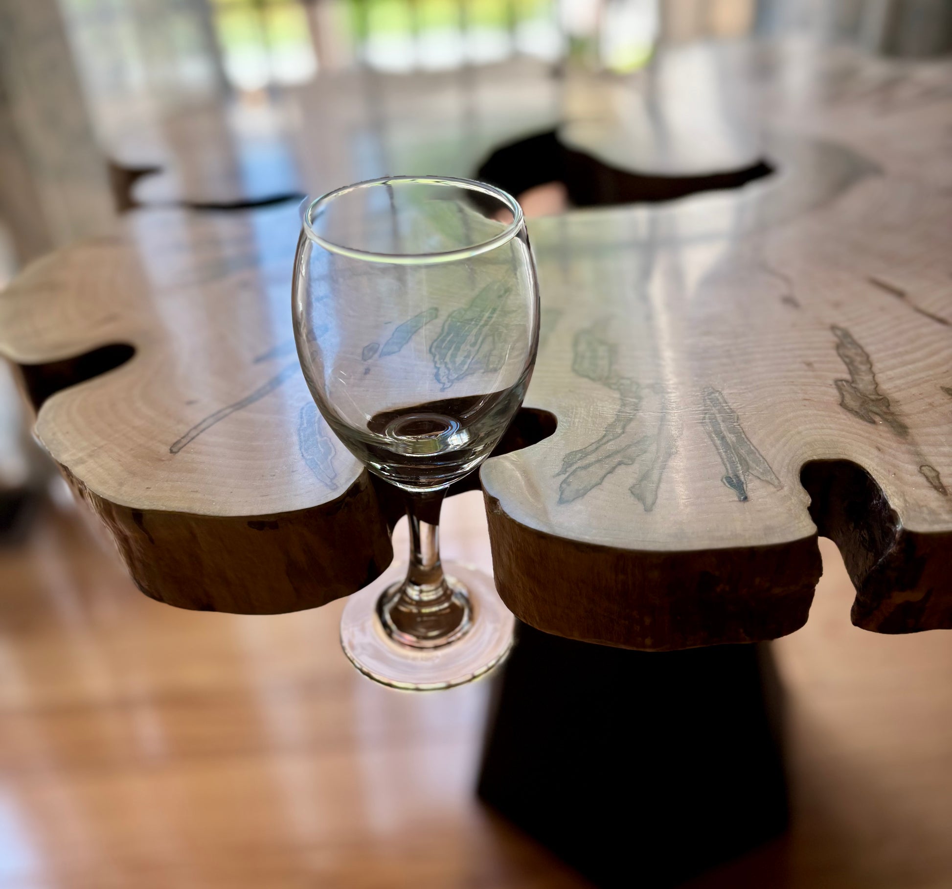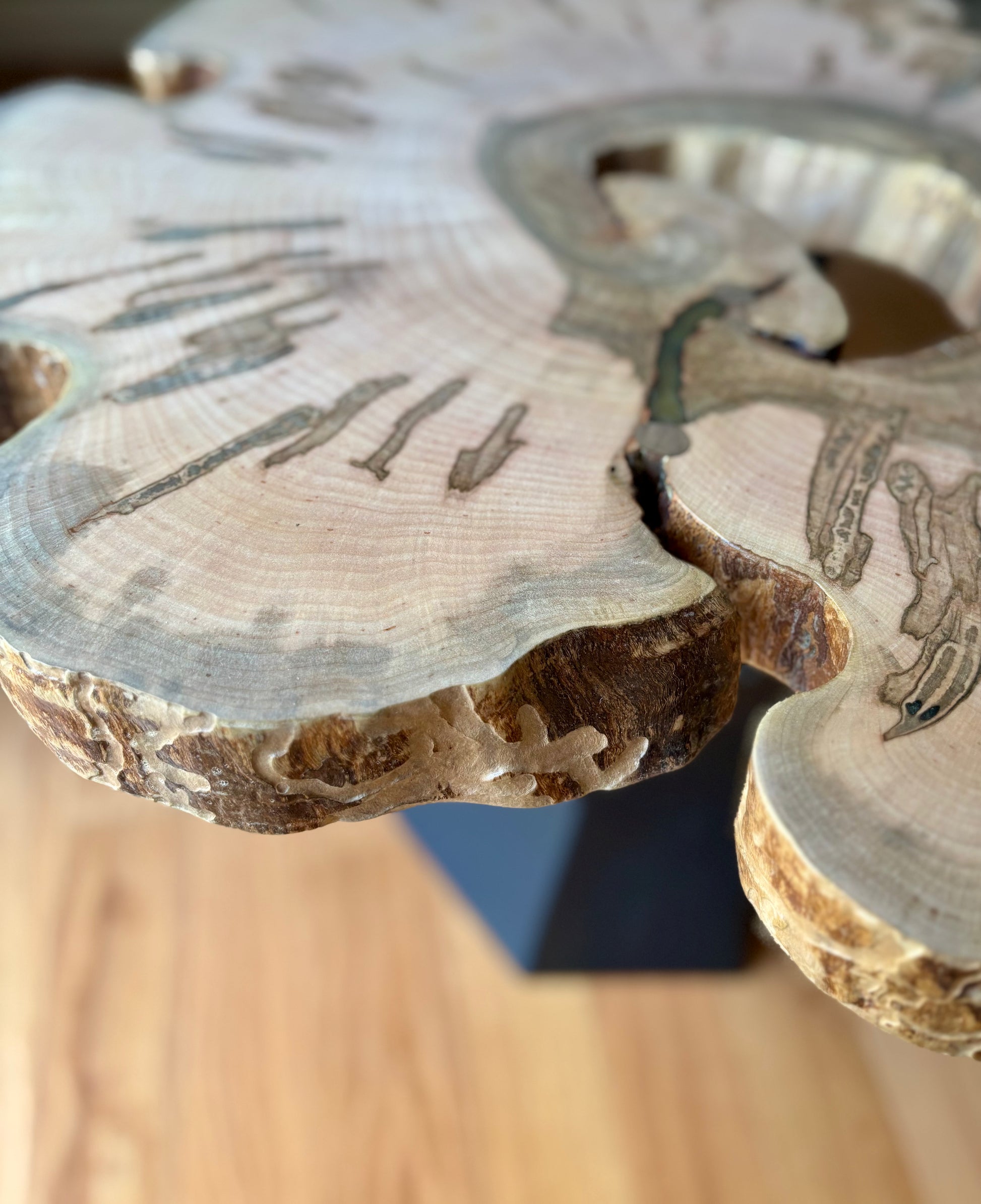 Handcrafted in Berlin, CT. this premium 2” thick hardwood maple slab, sourced from Plainville, CT, is engineered for dual functionality as both an occasional table and a charcuterie board. The surface is expertly buffed to a smooth, glossy finish and protected with a food-safe hybrid water-based urethane topcoat. Structural integrity is enhanced by walnut pegs reinforcing critical stress points. The slab is supported by a Namu-designed rust-resistant steel base featuring adjustable levelers for precise stability. Measuring 18” in height with an average diameter of 26”, this table exemplifies both craftsmanship and durability.