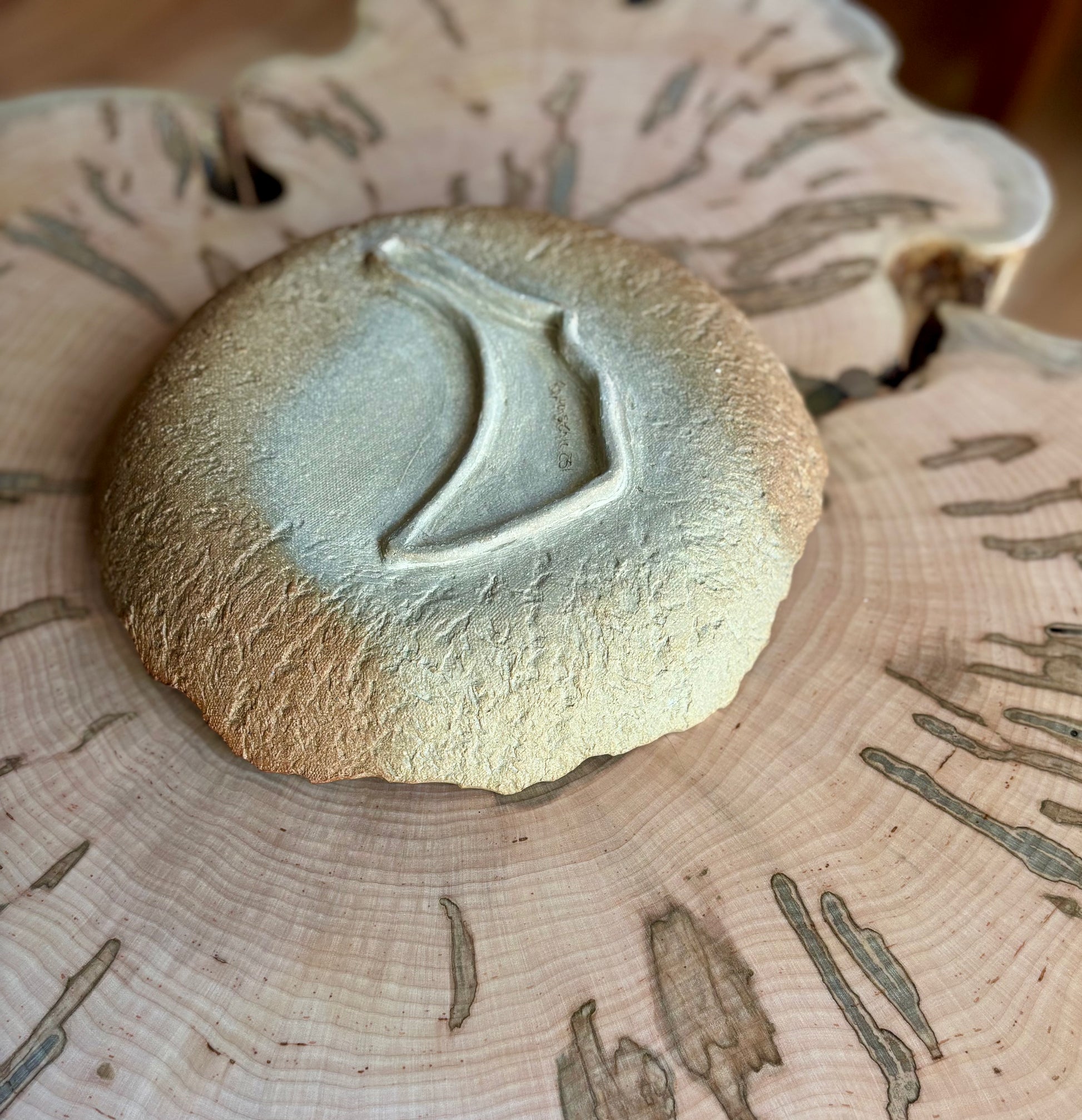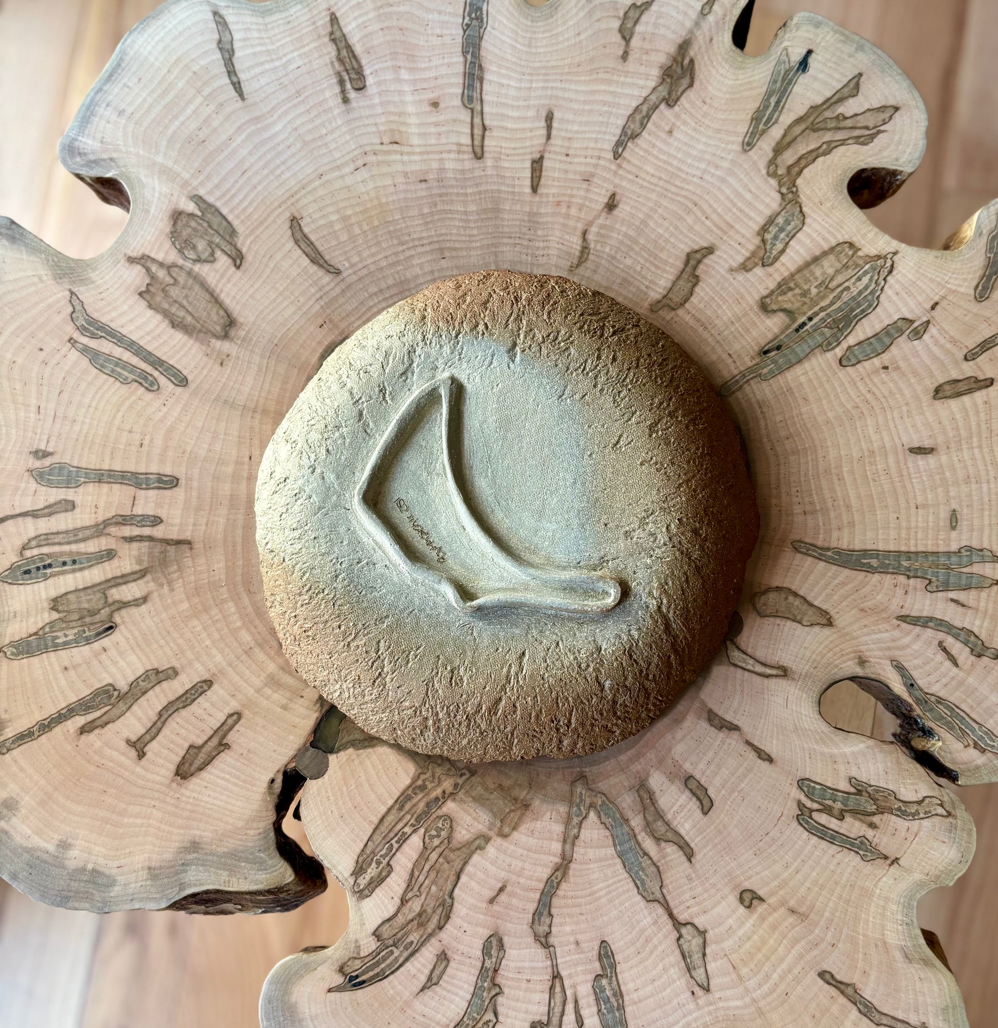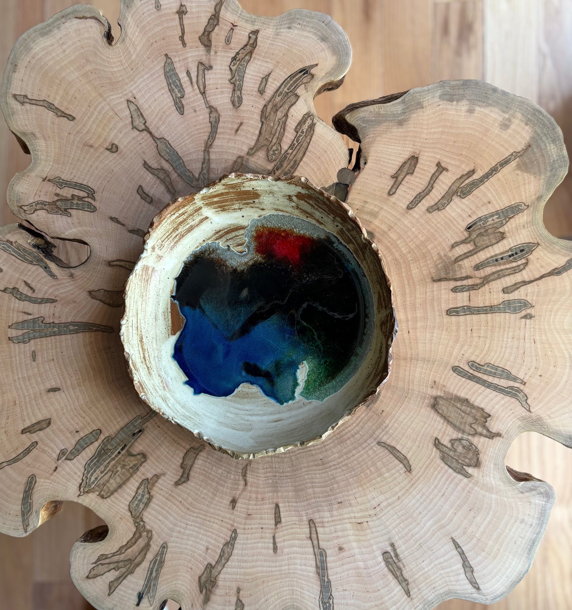 A custom-crafted 9.25” stoneware bowl, handmade by a local ceramic artist, fits seamlessly into the slab. The bowl’s exterior is stamped with a tree bark texture and remains unglazed, while the inner rim is finished with Mamo white glaze, creating a striking contrast against the layered stained glass melted at the base. Designed for versatility, the bowl can also be used independently.