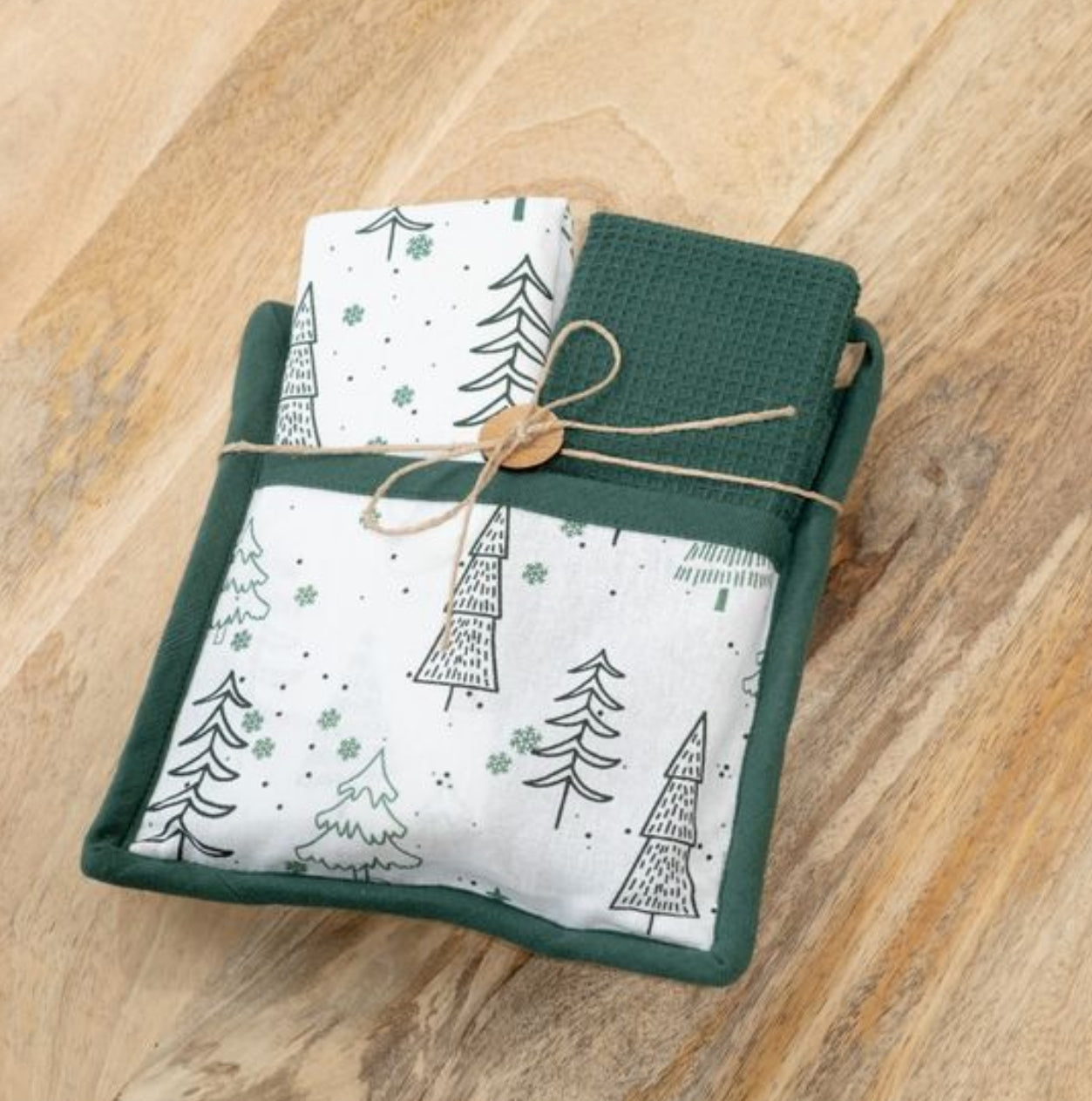 Set of 2 dish towels tucked inside the pocket of a matching potholder. One towel is a solid waffle weave, while the second towel in white features a matching pattern to the potholder