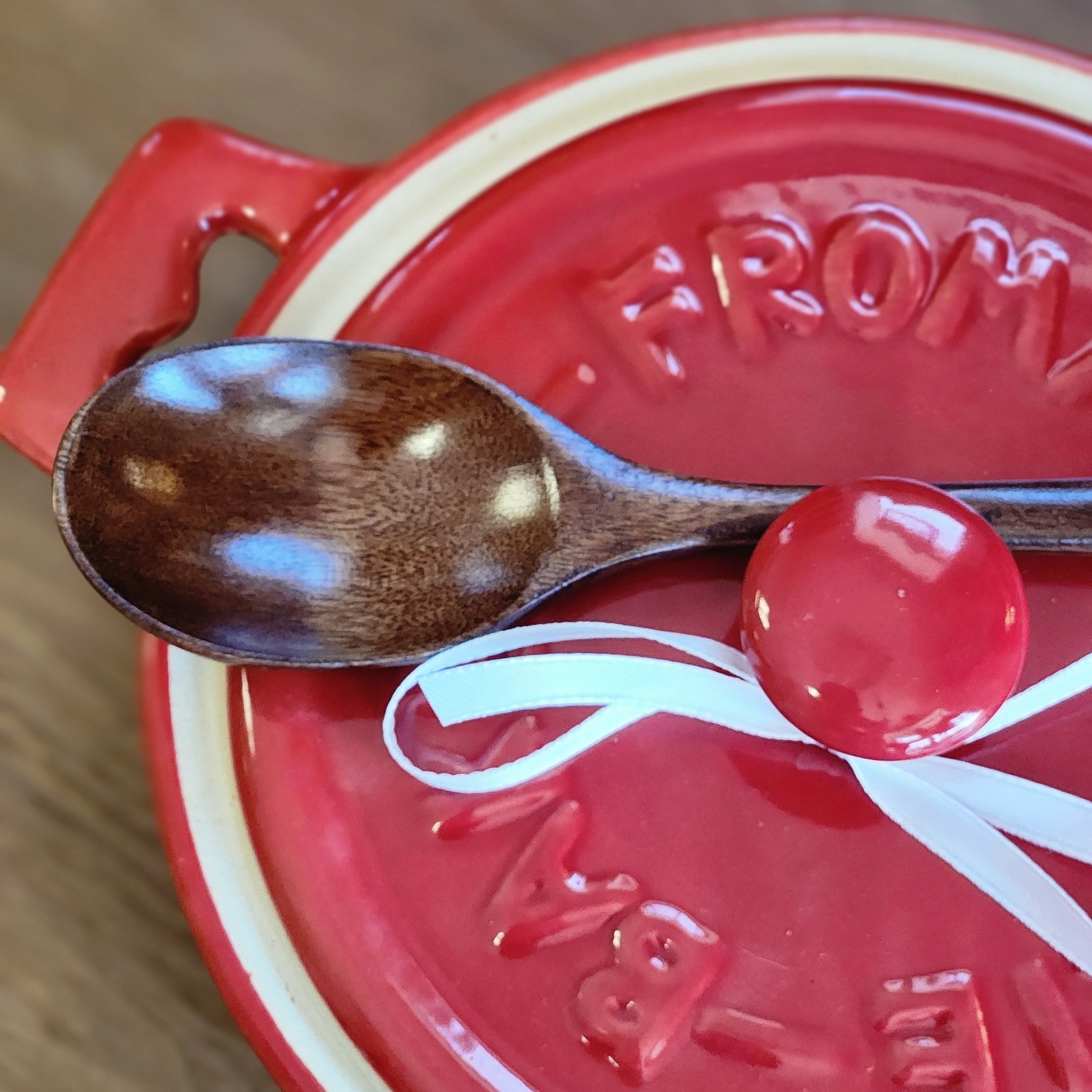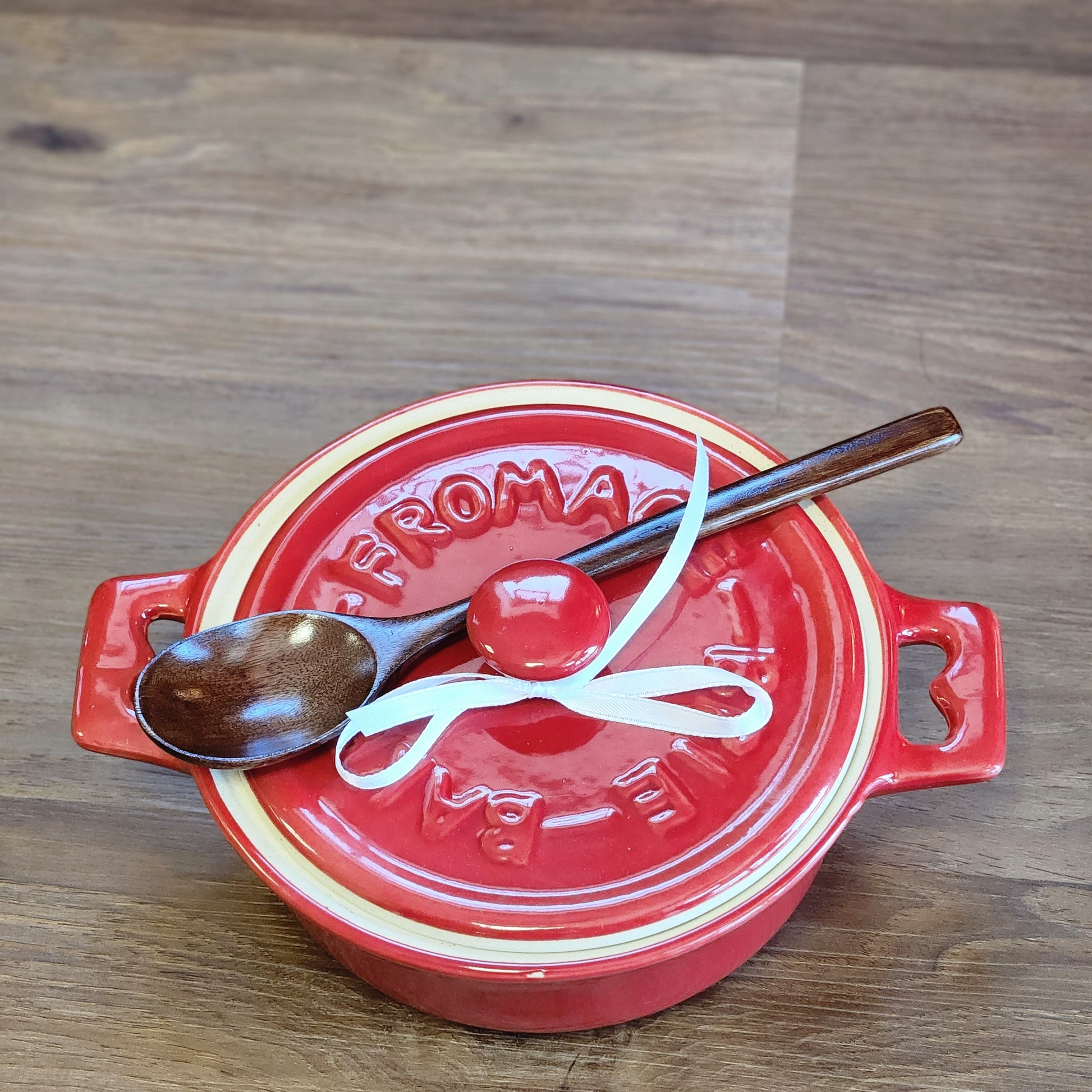 This Red Stoneware Brie Baker with Wood Spoon perfect for baking and serving cheese, dips, or appetizers in style.