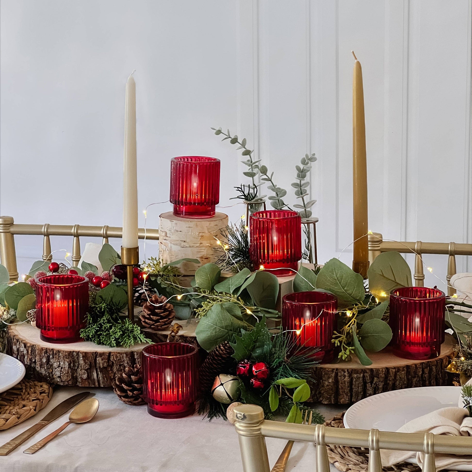 Get a bold look with these striking Ribbed Red Glass Votive Candle Holders