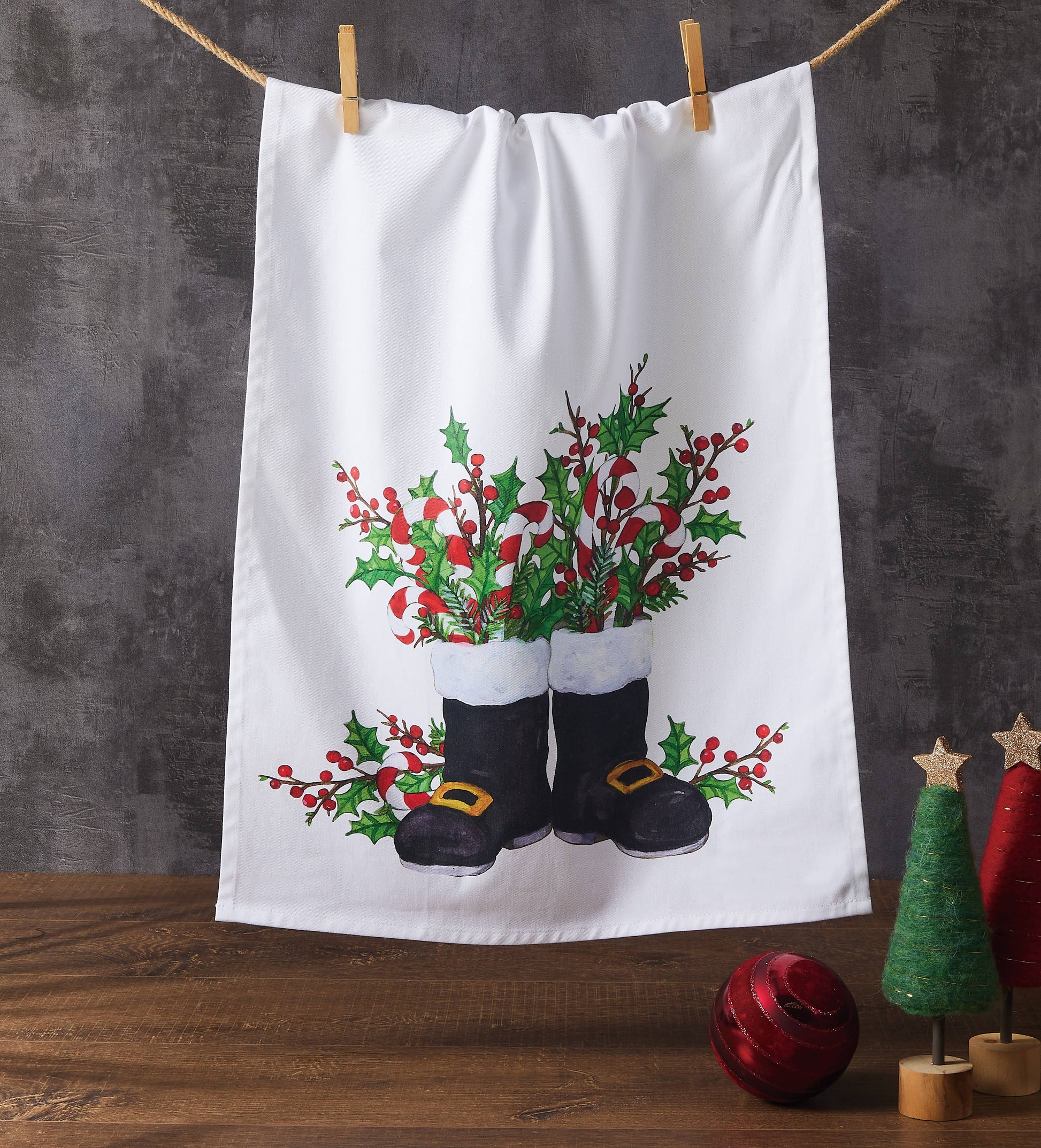 This 18x25" cotton kitchen towel, features charming Santa boots imagery. Both practical and decorative, it brings festive elegance to your kitchen while making a delightful holiday gift.