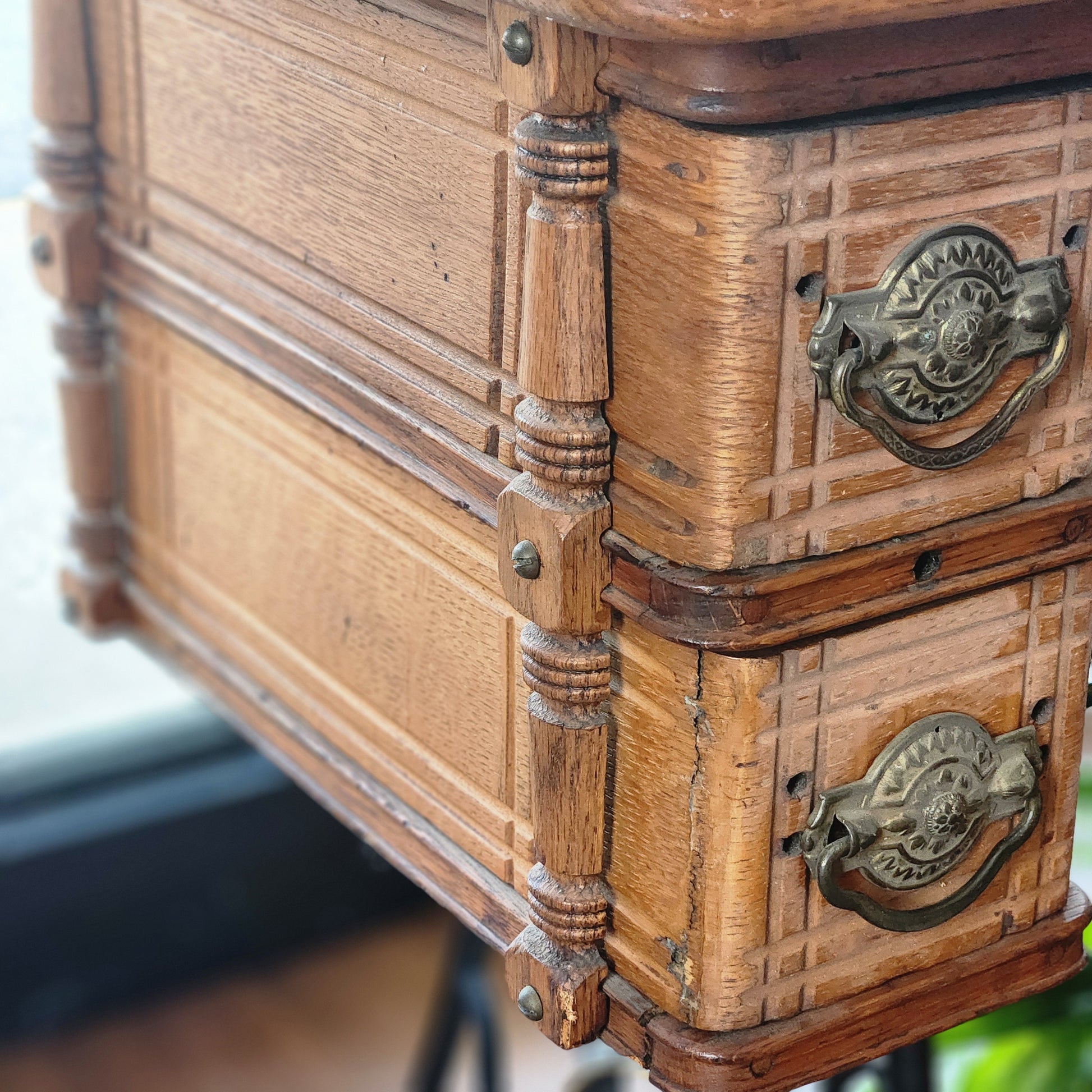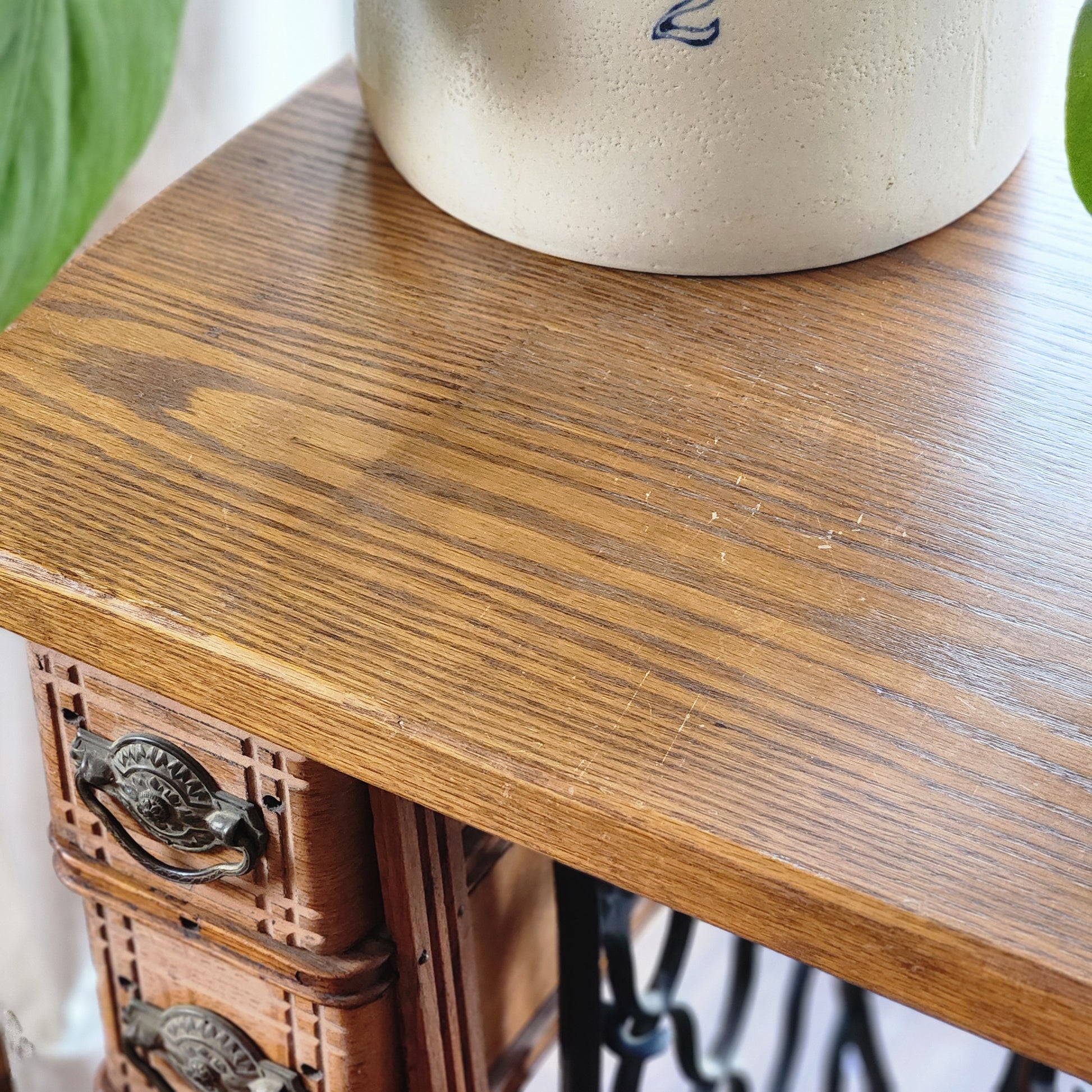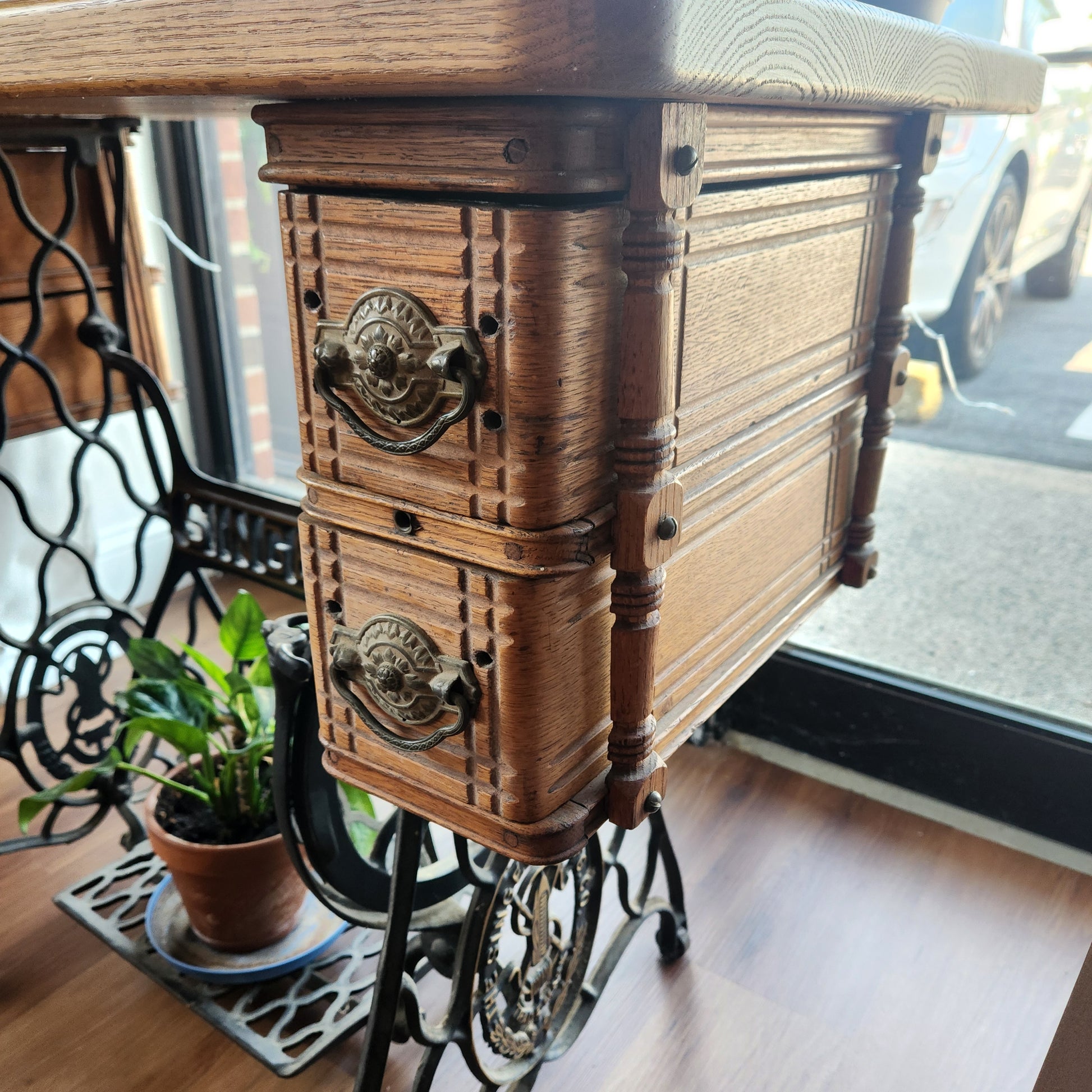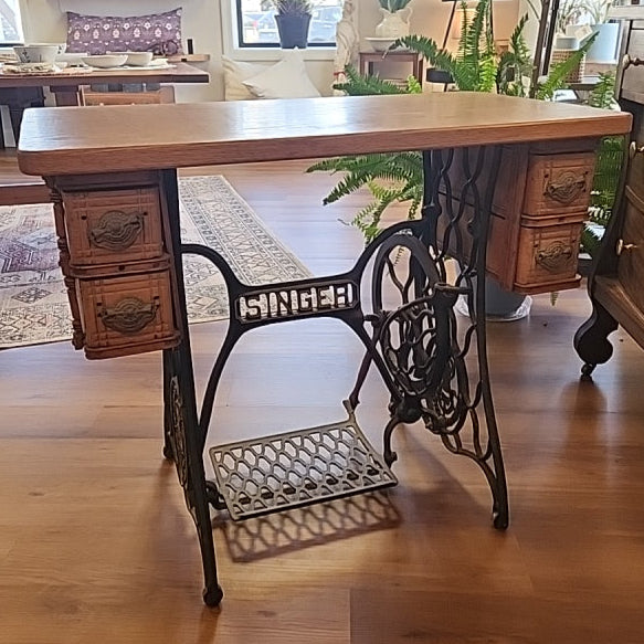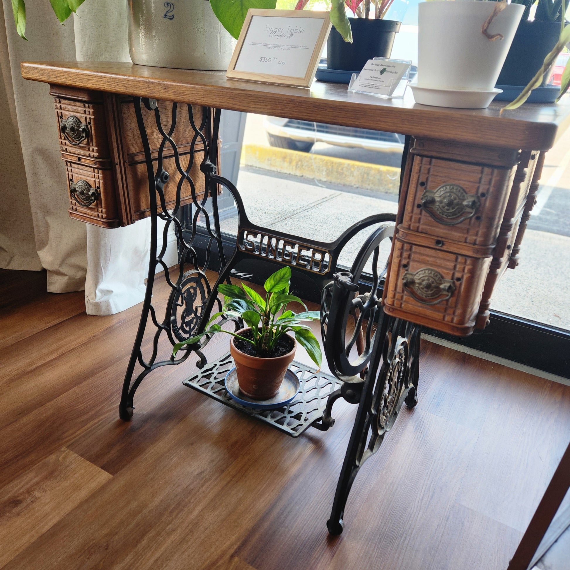 This beauty is what happens when you convert an old Singer Sewing machine into a stunning accent table. With the original iron base and decorative sewing drawers kept intact, a solid Oak tabletop was added to this to create a functional and solid table that is sure to be a conversation piece.