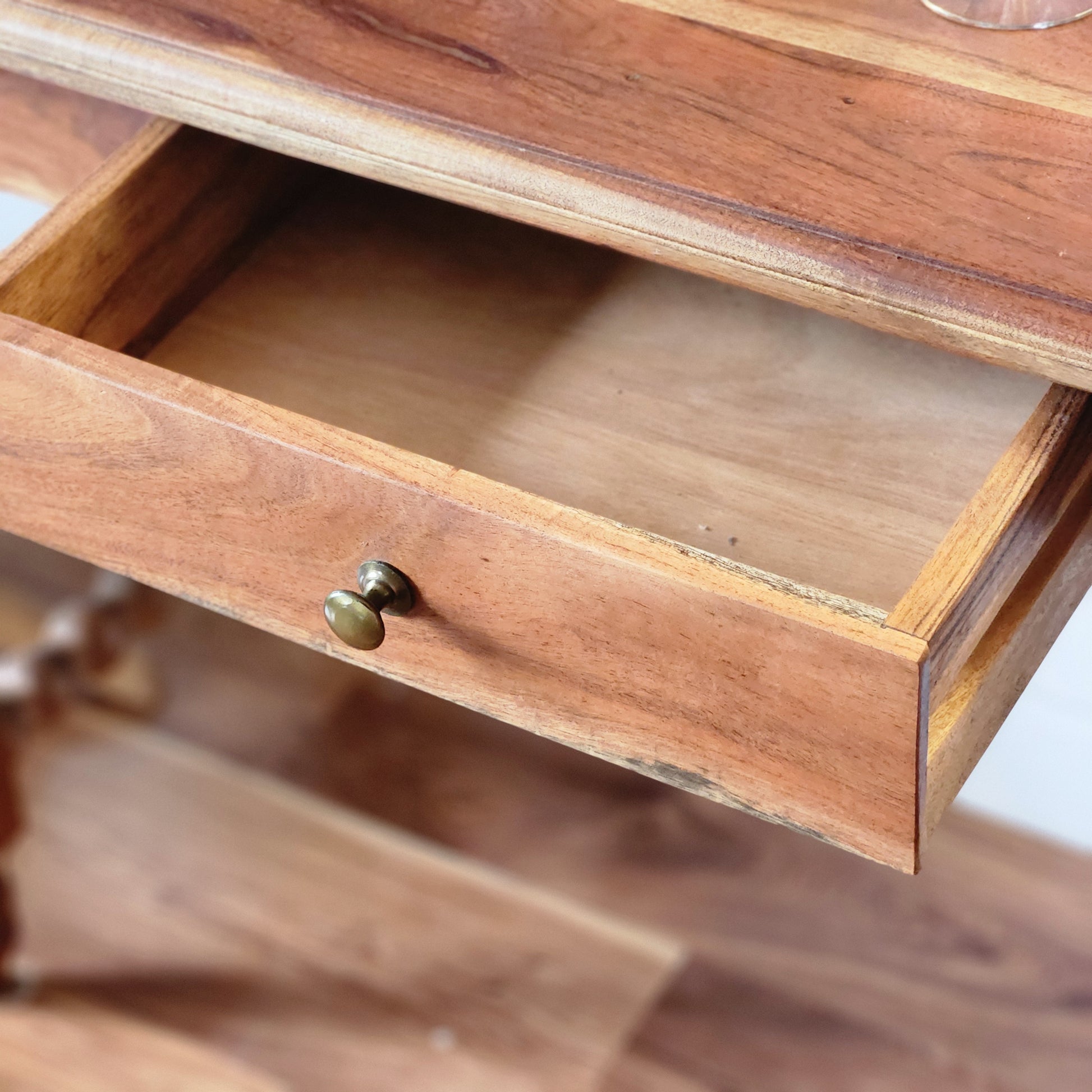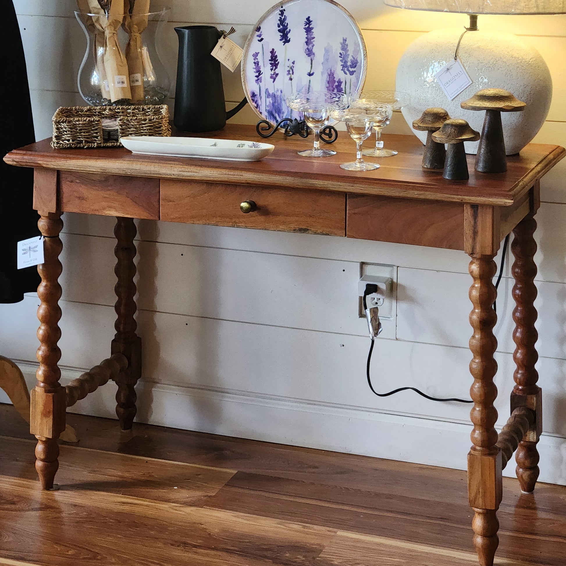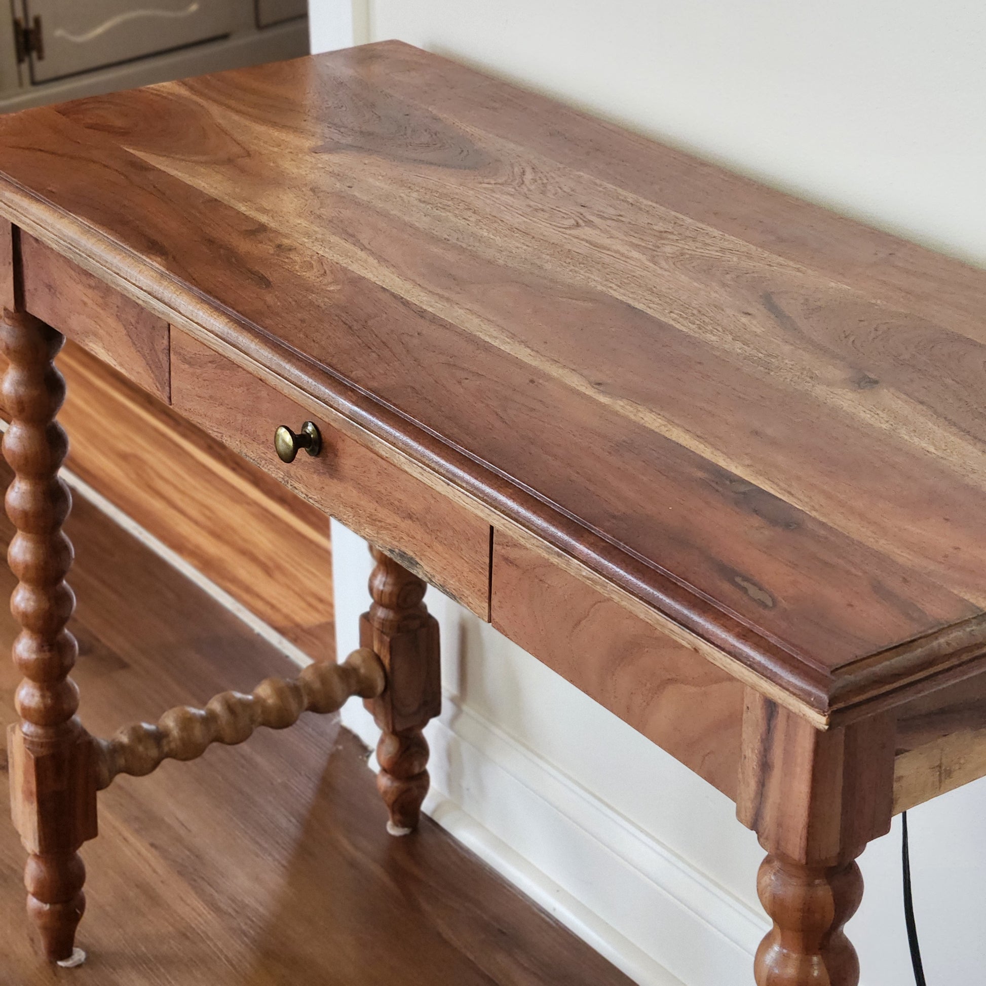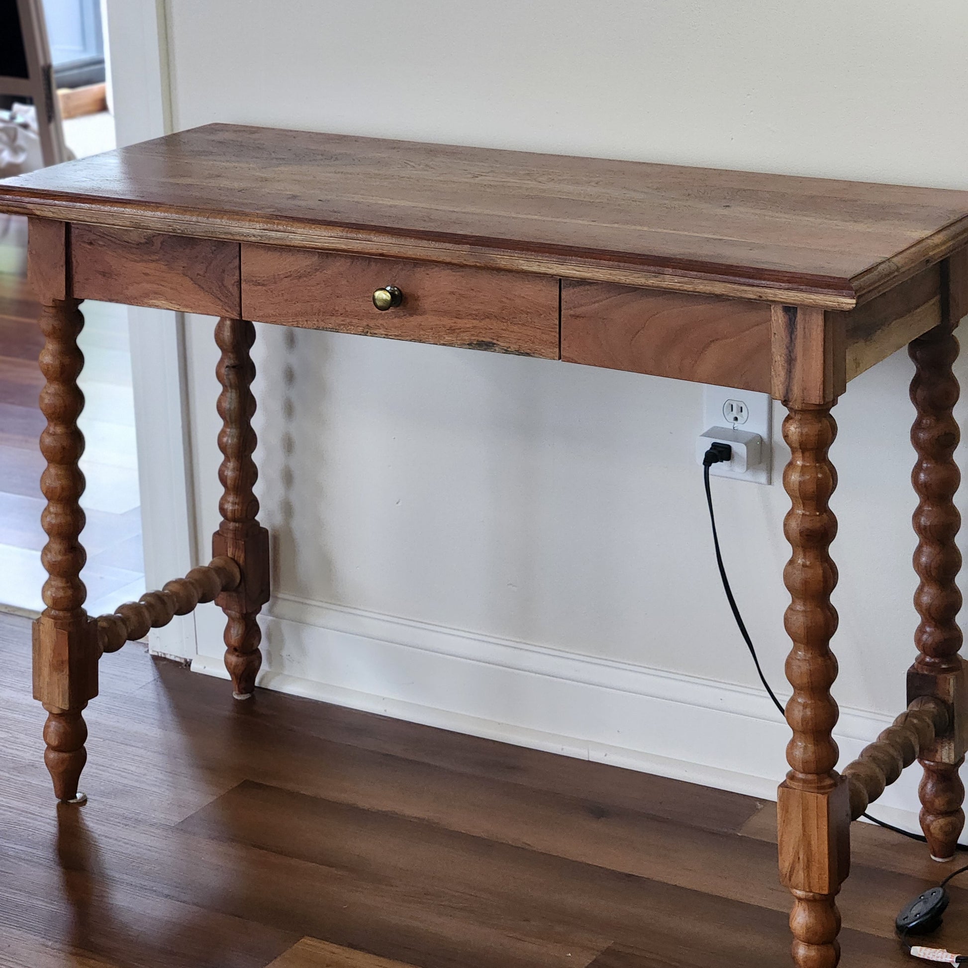 Beautiful Spindle leg desk/console is made solid wood and finished in a natural wood tone. Features a single drawer and elegant minimalist style.
